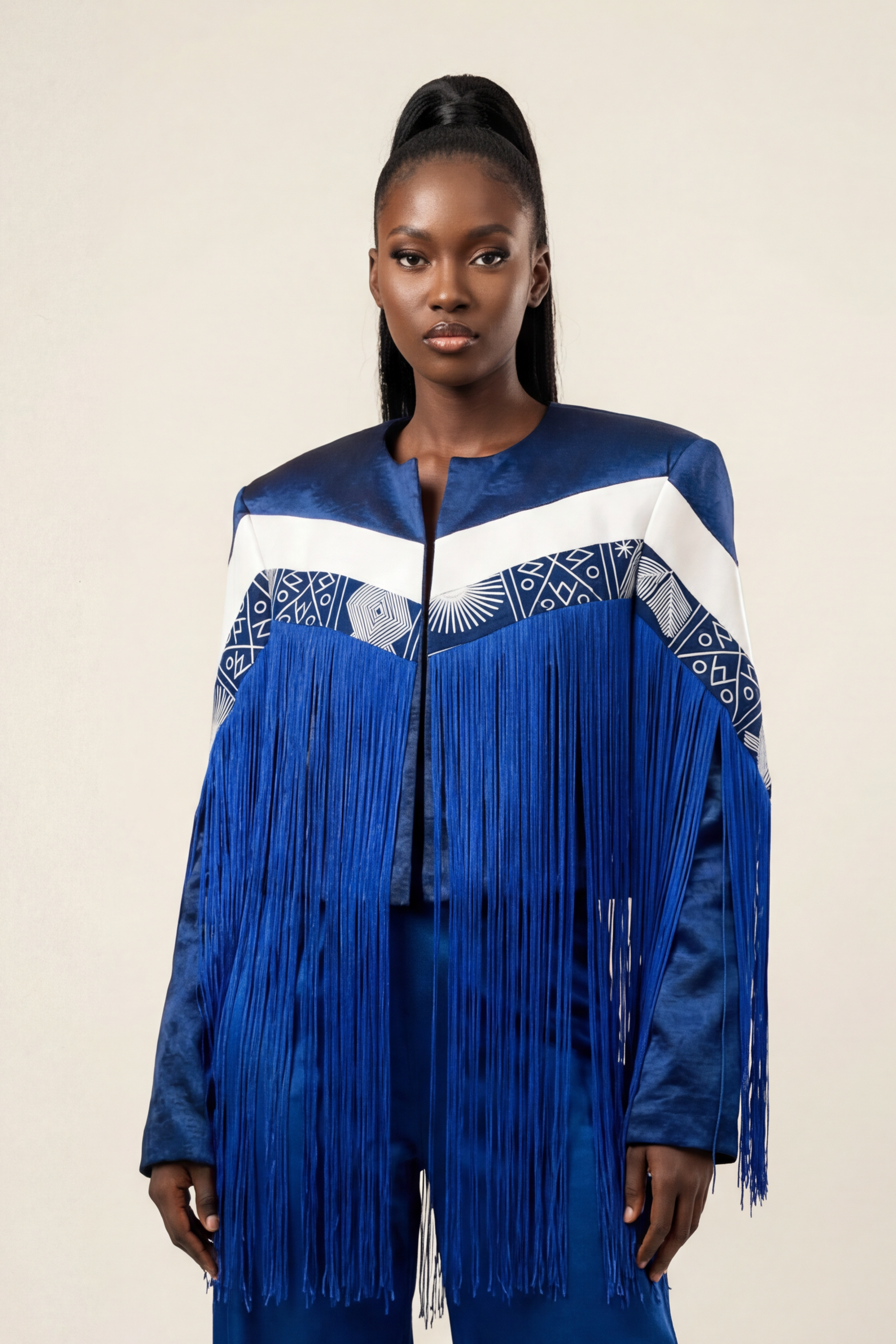 Mixed fabrics - Tafetta, leather, cotton print, polyester fringe.