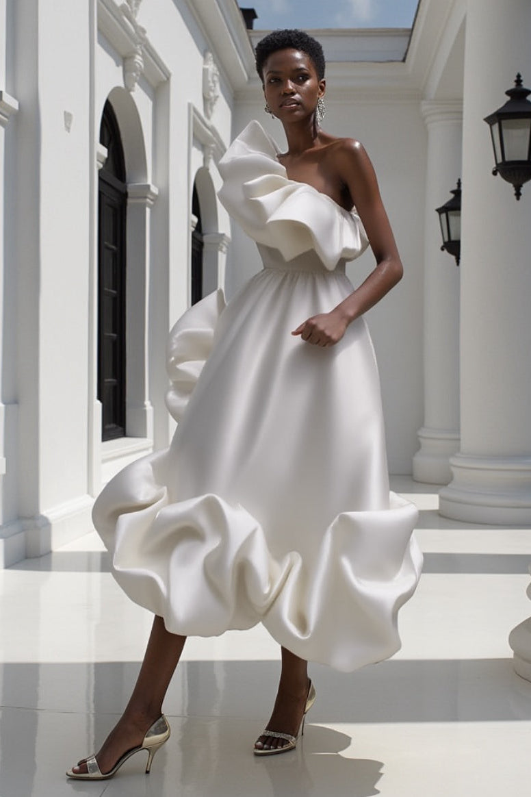 You’ll flounce into the party on a cloud. This ruffle number is as playful as it is elegant.